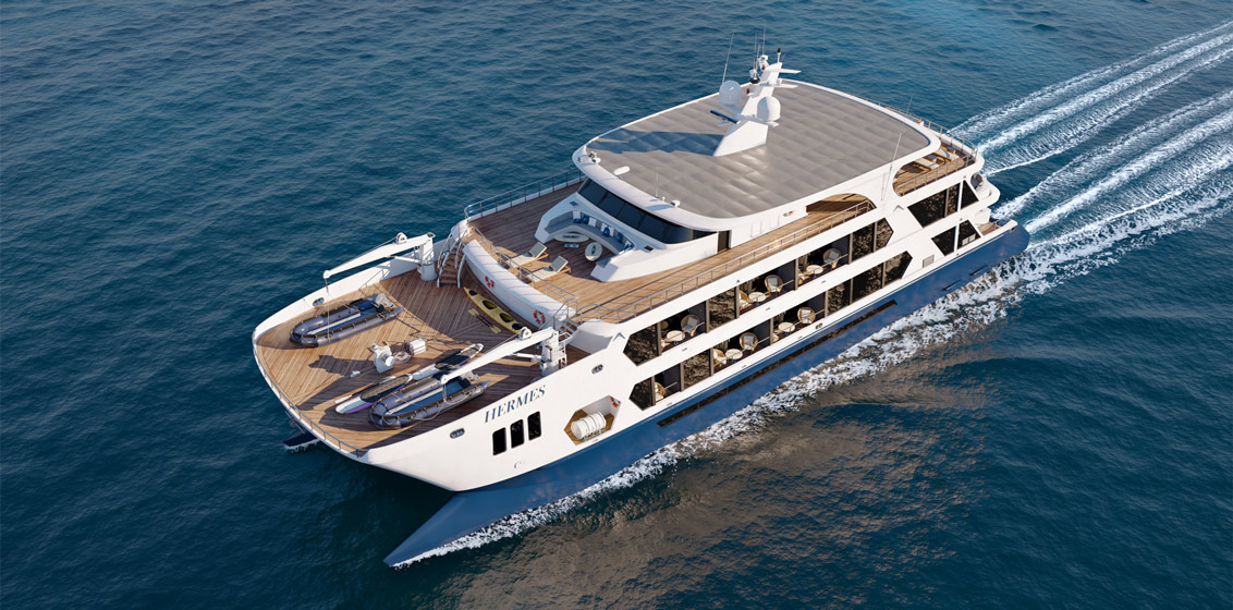 Hermes will accommodate up to 20 guests in 12 cabins. It will be the first ultra-luxury catamaran to sail the region, complete with butler service, hammam and with each suite offering a private jacuzzi and balcony.