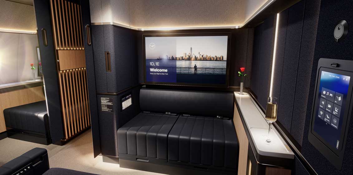 The Lufthansa Business Class Suite is characterised by higher walls, sliding doors, more personal space and a monitor up to 68 centimetres in size.