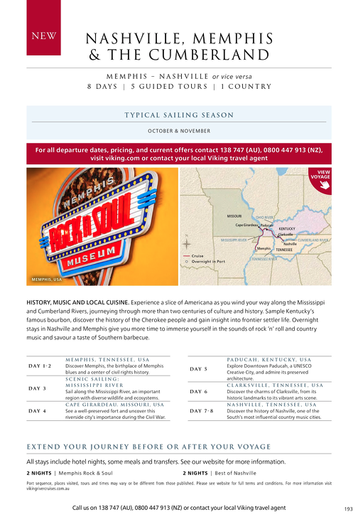 The 8-day Nashville, Memphis & the Cumberland journey, sailing between Memphis and Nashville, explores more than two centuries of culture and history along the Mississippi. Guests can discover the frontier lives of the Cherokee people, immerse in rock’n’roll and country music, and savour a southern barbecue or Kentucky’s famous bourbon. Sailings for this voyage are limited to only four departure dates between October 2026 and November 2026.