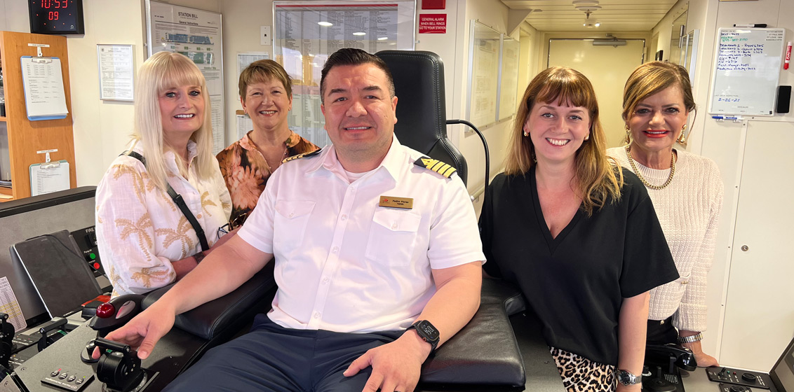 Lead image: Pictured on the bridge of Viking Mississippi with Captain Pedro Flores are Michelle Black (left), General Manager Viking Australia/NZ and Jane Moggridge (second from left), with VIP clients from Australia joining the duo on this voyage.