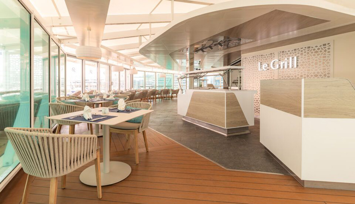 - Le Grill: Offering floor-to-ceiling views of islands and sea, this inviting indoor/outdoor restaurant adjacent to the pool will get a top-to-bottom makeover featuring a sleek, contemporary look in white with wood screens, ceramic tiles, and trim framing culinary stations, and soft oak wood furnishings crowned by stylish bamboo light fixtures.