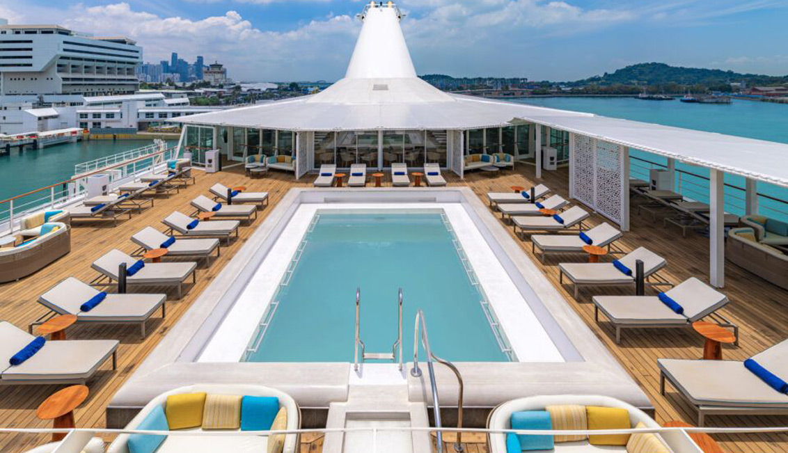 - Pool Deck: A sweeping new white canopy will shade cabana-like seating on the port side of the newly refinished teak pool deck, while the façade of the pool itself will be wrapped by a new mosaic banner. Ample white chaise loungers will surround the space, ensuring blissful moments of sunshine and scenery.