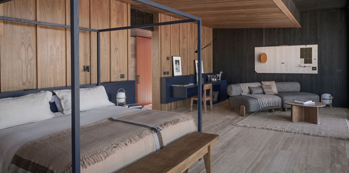 Among the design highlights is the use of the little-known travertine marble sourced from nearby Calama in the guest lounging areas, while deep blue tones create a rustic elegance that connects with the desert landscape. More than 40 local artists and designers have created unique pieces for the interiors, adding quality, beauty, and a sense of cultural belonging to the hotel’s narrative.