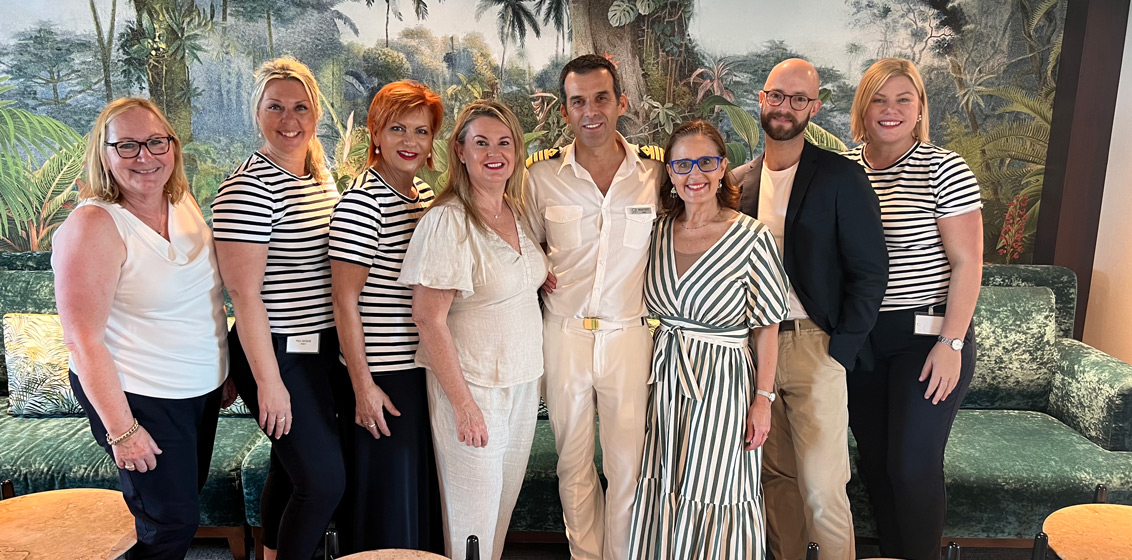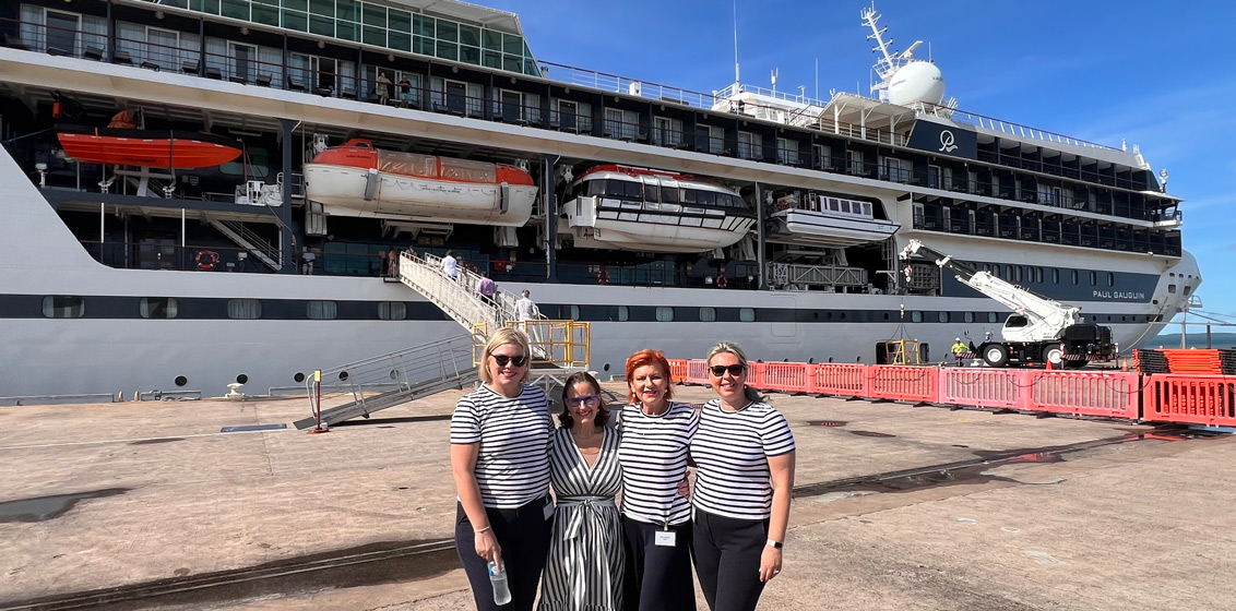 PONANT/Paul Gauguin Cruises welcomed a group of travel partners from around the country to Darwin earlier this week to a very rare ship visit of ms Paul Gauguin. The 330-passenger luxury ship was passing through the Northern Territory capital having just undergone its latest refurbishment in Singapore which was centred on sustainable engine enhancements to meet Ponant’s stringent green credentials.