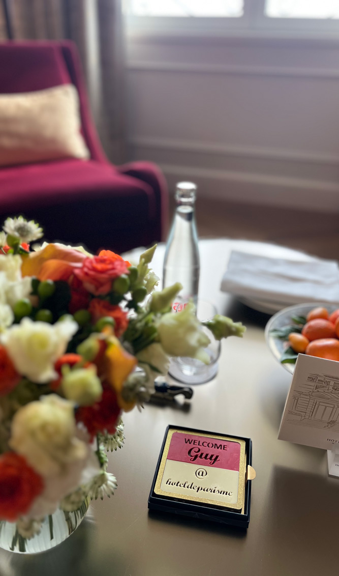 On the dresser is a small bottle of the hotel’s parfum (available to purchase for 125 euros), a dramatically shrunk down version of the perfume bottle that greets guests in the elevator lobby when exiting the hotel lift.
