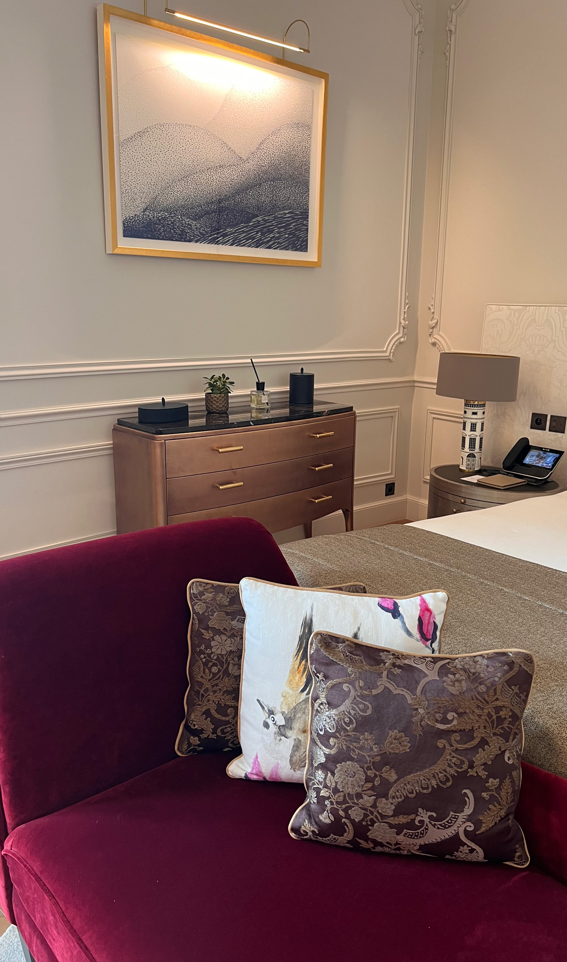 The herringbone pattern wooden floorboards lead from the entryway down a small hallway. On one side is an overly spacious floor to ceiling marble clad bathroom with a double vanity, deep standalone bath and separate rain-head shower (with a full width, built-in seat). On the other is a separate washroom with an electric bidet, a small handbasin and mirror, and a separate walk-in closet with ample storage for a three- to four-night stay for two people.At 42 sqm, my sanctuary for the next 18 hours has a copious amount of space. The king bed is donned with four sleeping pillows of different weights and five smaller and colourful scatter pillows. Bedside table lamps resemble historic multi-storey houses, or perhaps it’s the facade of the hotel itself. A red velvet chaise lounge sits at the foot of the bed, opposite which is a slipper chair in matching material.