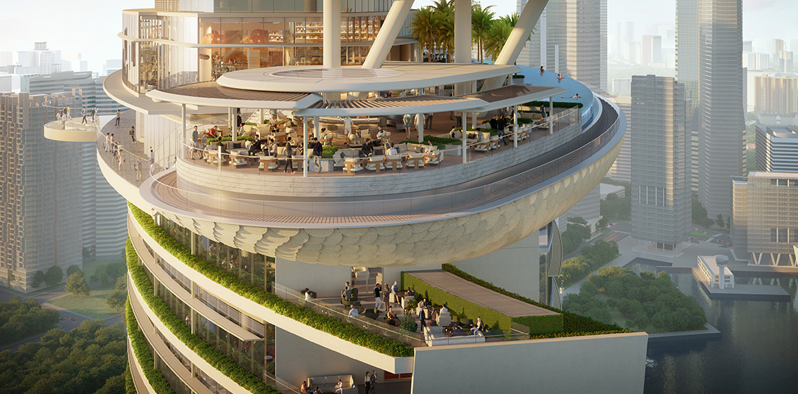 Set at a 45-degree angle to frame views of both the Marina Bay and the Singapore Strait, the hotel tower spans 55 storeys. A focal point of the design will be biophilic elements, with a significant number of green amenities across the development.