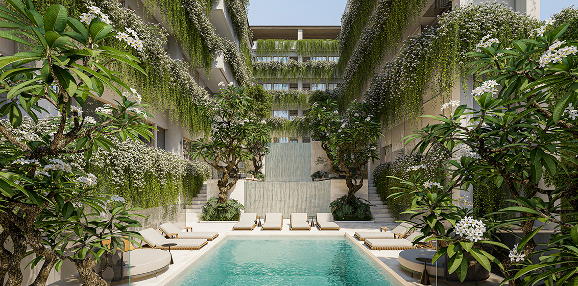 Umi’s architectural vision draws inspiration from the dramatic sea caves of Suluban Beach. Designed in a sweeping U-shape, the resort mirrors the natural curves of the cliffs, opening out to a series of cascading infinity pools that follow the land’s natural contours. The building is wrapped in sculptural planter boxes, blending sleek modern lines with vibrant greenery—evoking the sensation of being cradled within Uluwatu’s cliffs.