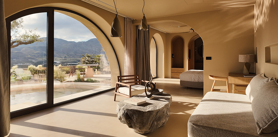 Athens-based design studio Pieris.Architects and landscape architect Karolos Chanikian were tasked with creating an aesthetic where buildings seemingly disappear into the surroundings. In addition, suites utilize biophilic designs that reportedly optimize energy efficiency and carbon absorption.