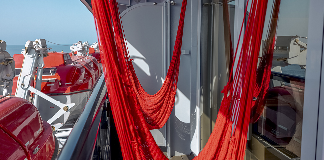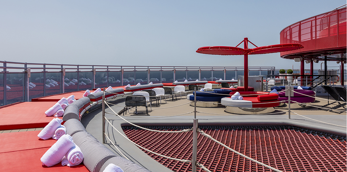When space became precious, Virgin got creative with connection, the cruise line said in a press release. The reimagined Sea Terrace (Slightly) Smaller Balconies will now offer two red hammock chairs instead of one—”because the best views are meant to be shared.”