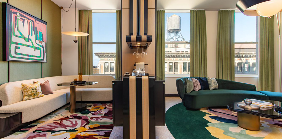 Inspired in part by the grandeur and symmetry of Grand Central Station, the Living Room showcases soaring ceilings, intricate moldings, and early twentieth-century charm. The hotel’s iconic grand staircase has been transformed with a mesmerising carpet that appears to drip and pool in a cascade of abstract colours, guiding visitors up its elegant curve wrapped in lush botanicals.