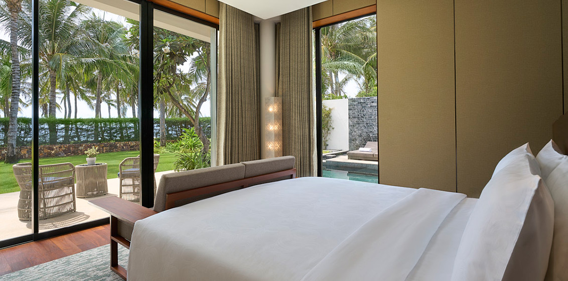 JW Marriott Cam Ranh Bay Resort & Spa features 203 elegantly designed guest rooms and private villas, each curated to inspire restoration and a deep sense of connection. Interiors reflect the coastal beauty of Cam Ranh with organic tones, natural materials, and refined wooden accents, including lattice partitions that echo traditional Vietnamese design.
