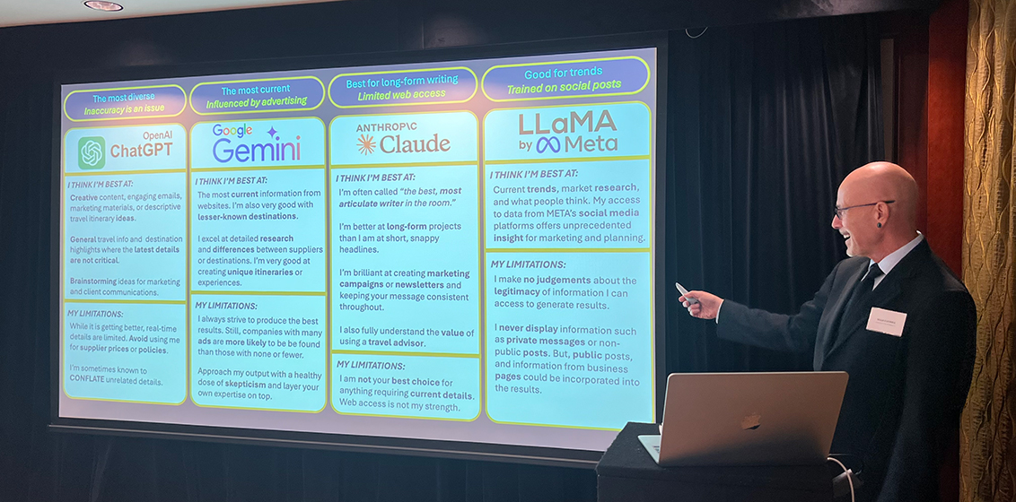 The visiting Vancouverite suggested that AI might also be “more helpful in travel marketing than anything,” discussing the four biggest players in the artificial intelligence space, namely ChatGP, Gemini, Claude and LLaMA – and how they differ.