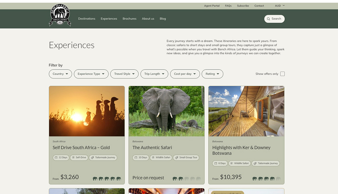 Each experience page includes detailed day-by-day content, rich imagery, interactive maps, and the ability to send enquiries directly to the Safari Specialist team. The site also connects seamlessly to Bench Africa’s Agent Portal, which houses refreshed marketing assets and training resources.