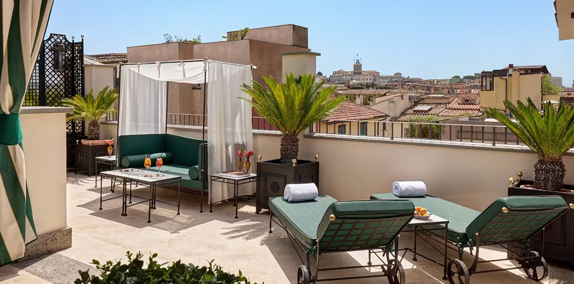 Rooms and suites are uniquely styled like a private residence, blending antique pieces with contemporary craftsmanship. Highlights include Executive Suites, Balcony Suites overlooking Roman rooftops, and the Penthouse Suite with a 70 square-metre terrace framing views from Villa Medici to the Vittoriano. The new SPA Suite, which debuted in July 2025, offers an intimate wellness sanctuary with treatment areas and signature rituals.
