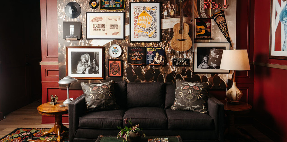 Designed by Sarah Stacey Interior Design with the Ryman as inspiration, the suite sports vintage concert posters, well-worn guitar picks, pennant flags, exclusive photographs of performers who graced the legendary stage and more.