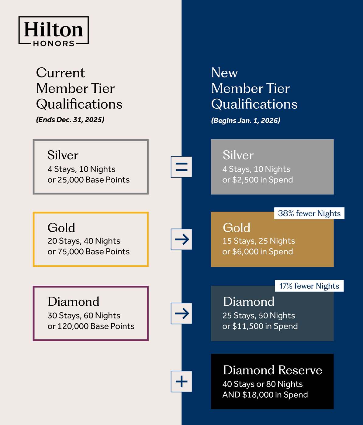 - With these changes, Hilton has reduced the requirements whether through nights, stays or eligible spend to reach Gold and Diamond tiers, beginning next year.