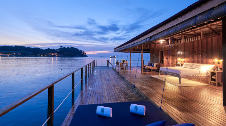 A new floating villa will open at Banyan Tree Bintan in Indonesia from 15 July, 2019. The Kelong Villa is a built as a tribute to traditional offshore stilted platforms used by local fisherman. Positioned about 250 metres from Laguna Bintan integrated resort, guests access the Kelong Villa by boarding a pokchai (motorised wooden boat) on the beachfront, taking the two minute ride across to the dwelling.