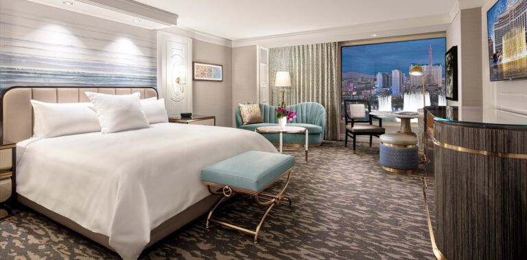The Bellagio in Las Vegas has unveiled refreshed new guest room designs and upgraded in-room amenities.Encompassing all 2,568 guest rooms in the resort’s main tower, the new designs take inspiration from the movement of water, the beauty of nature and the vibrant reflections of light seen at sunrise and set. Featuring a luxurious oversized shower, dual sinks, a built-in closet and an activity table, Bellagio’s new guest rooms reflect thoughtful use of each space.