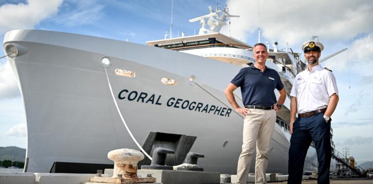 Coral Expeditions welcomed its newest bluewater expedition vessel to its fleet with an intimate ceremony in Cairns late last month. A sister-ship to Coral Adventurer, Coral Geographer has the same specialised design for rugged extended expeditions to remote areas.