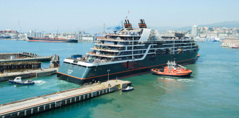 The hull of Seabourn’s first purpose-built expedition ship has arrived at the T. Mariotti shipyard in Genoa, Italy for the vessel’s final fit-out.