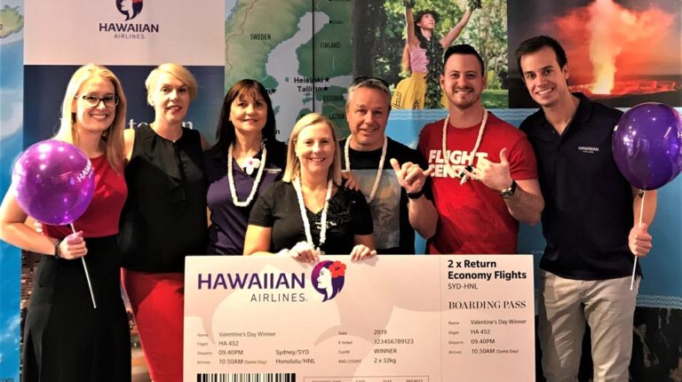 Hawaiian Airlines and Flight Centre teamed up to spread the Aloha spirit in Australia this Valentine’s Day. Lucky couples from Sydney and Brisbane won free trips yesterday to Hawaii by participating in ‘quiz show’-style events staged in Flight Centre’s Sydney and Brisbane CBD premises … taking off for Honolulu last night!